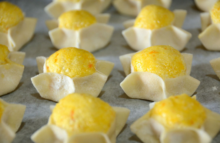 Ripieno.Per prima cosa si prepara il ripieno mescolando 1 uovo intero e 3 tuorli assieme alla buccia d’arancia e di limone, ad un pizzico di zafferano, allo zucchero e a circa 200 kg di farina: una volta ottenuto un composto omogeneo lo si lascia riposare e ci si dedica alla preparazione della sfoglia.